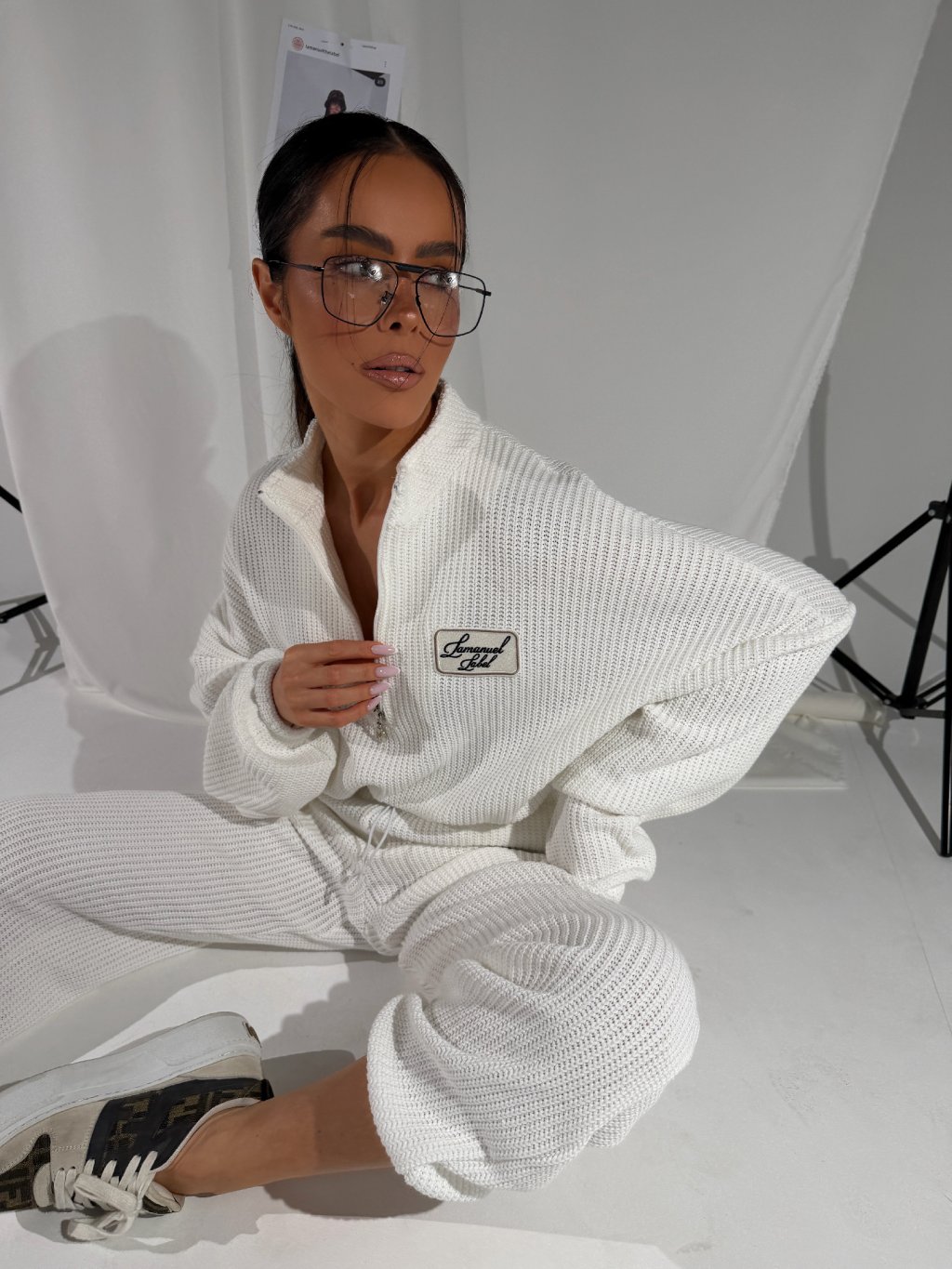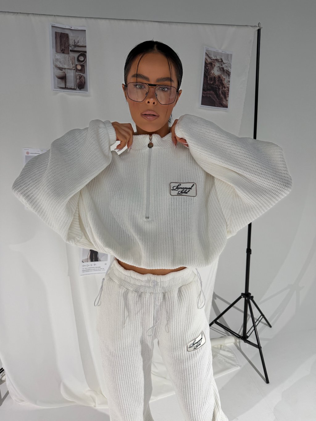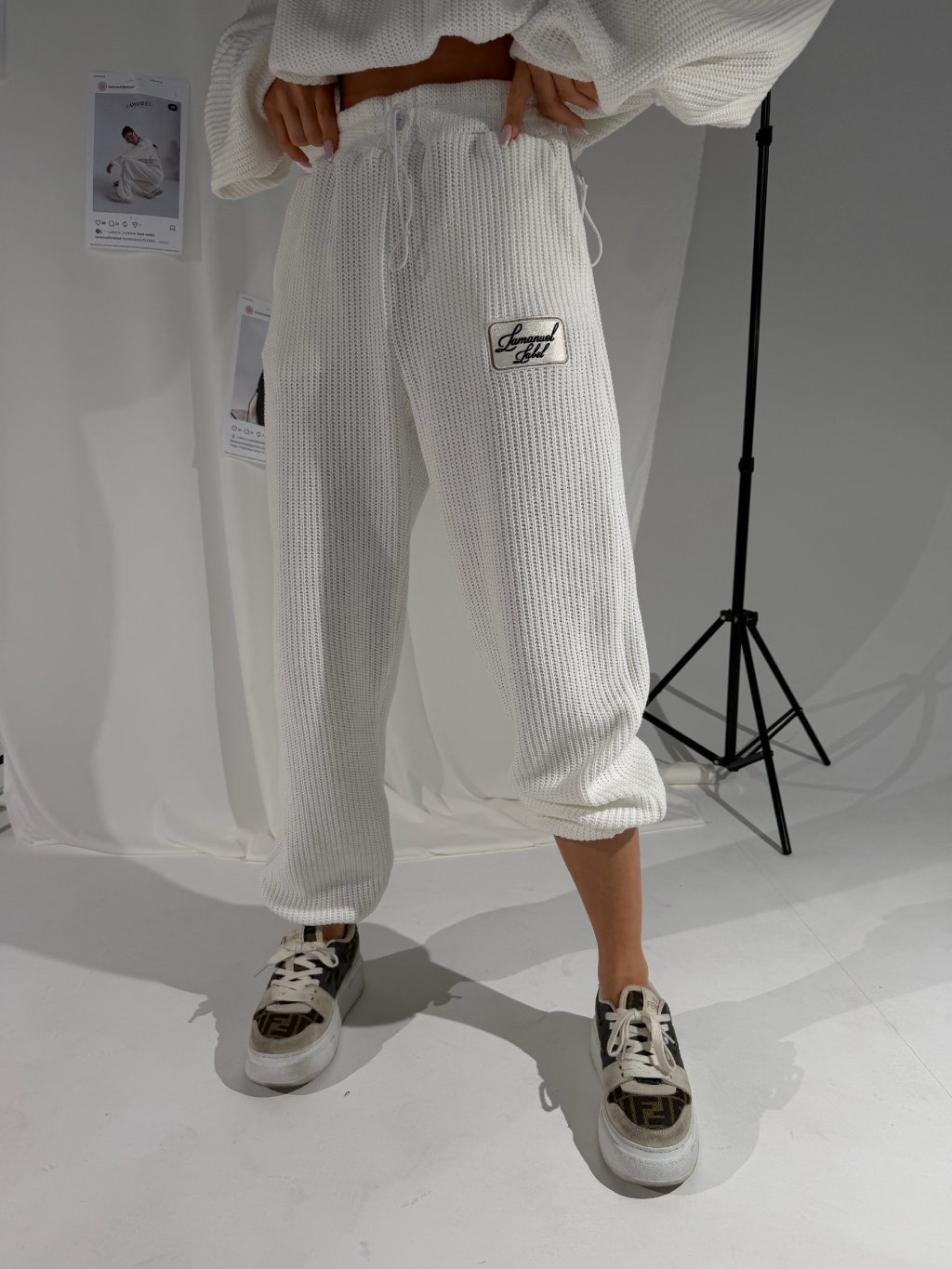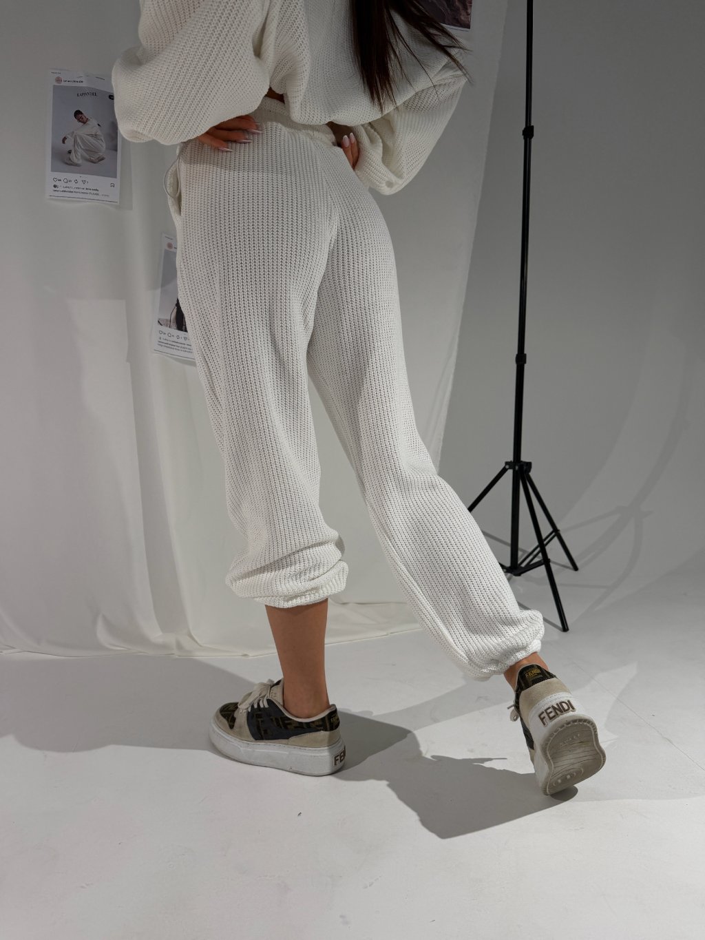 Voľné pletené nohavice s elastickým pásom a jemne zúženým strihom, ktoré kombinujú pohodlie s premysleným mestským vzhľadom.