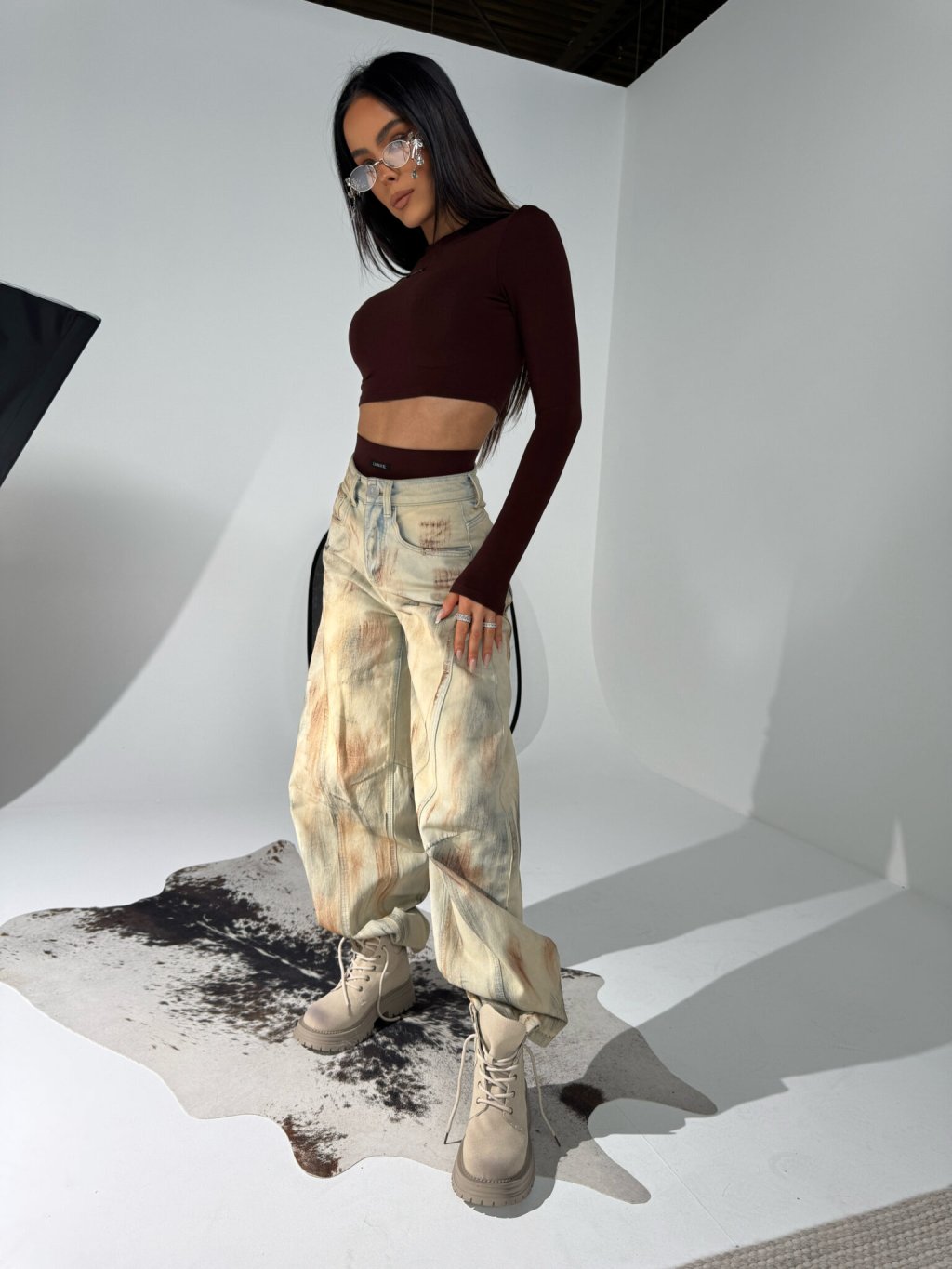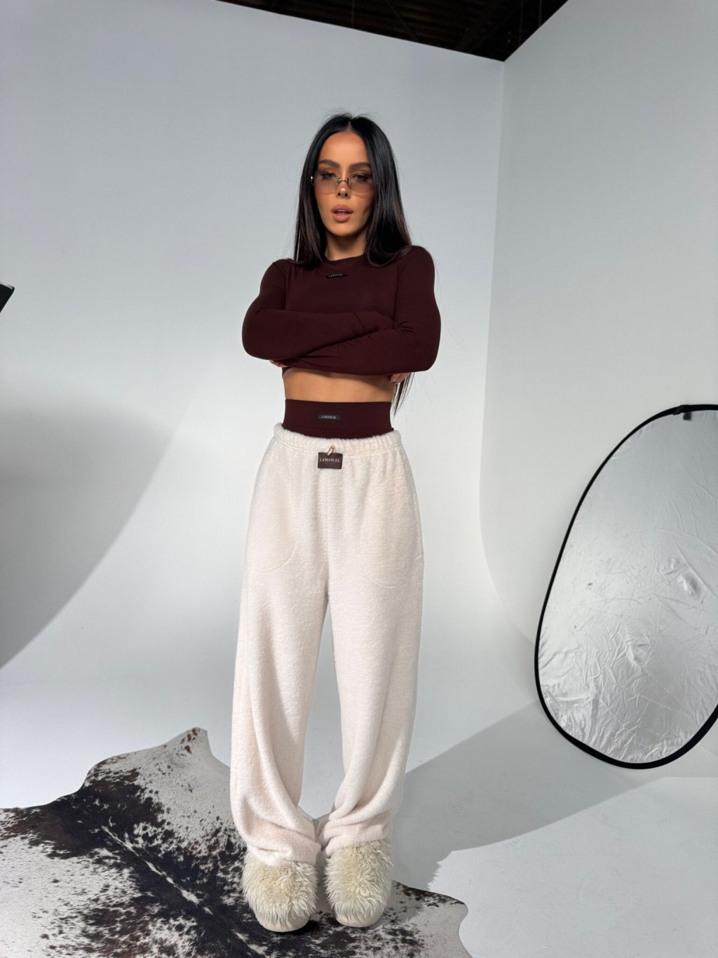 Minimalistický dvojdielny set z jemnej viskózy - priliehavý top s dlhým rukávom a tangové nohavičky s vysokým pásom. Ideálny ako základ outfitu aj na vrstvenie.
