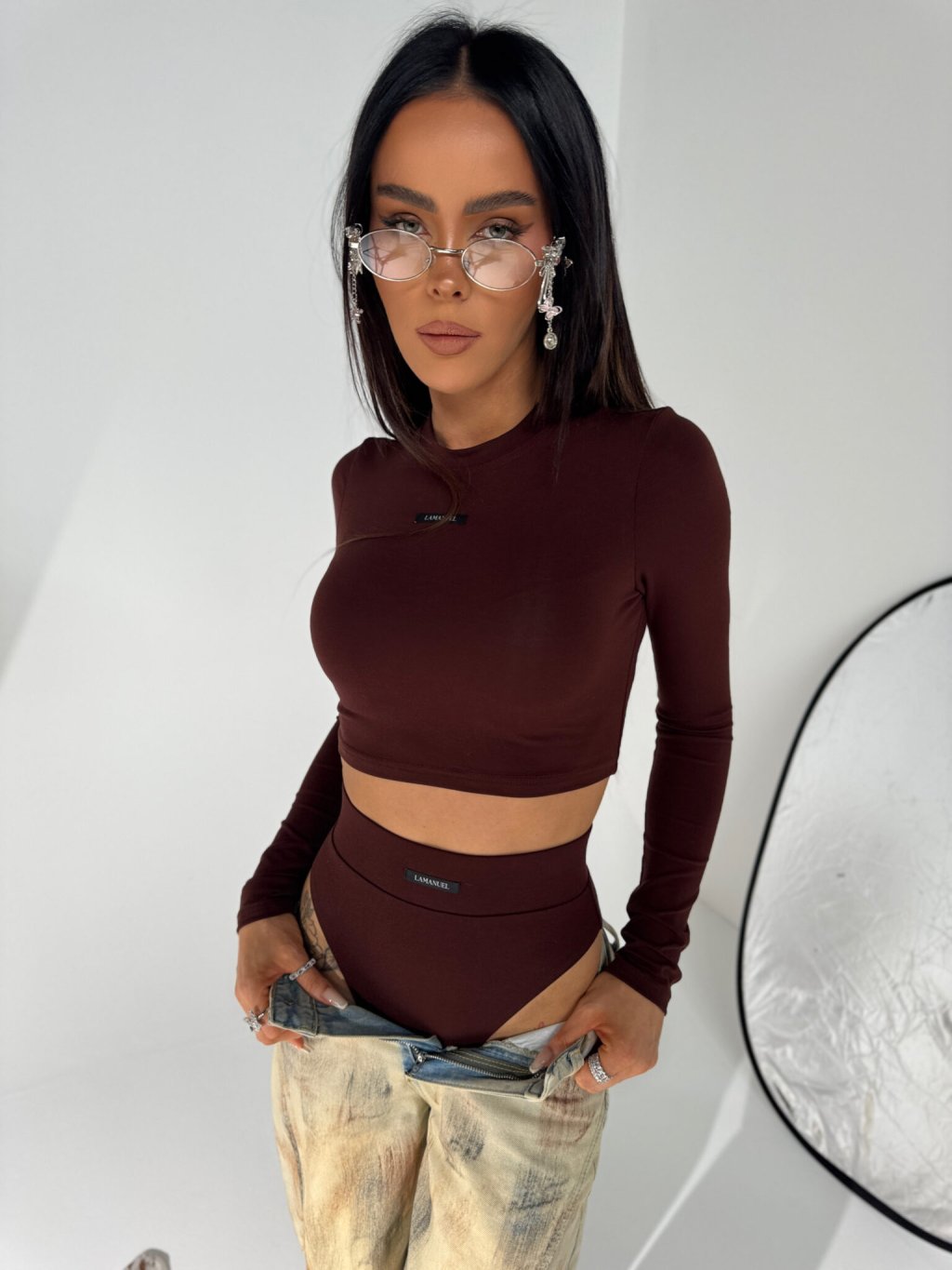 Priliehavý top s dlhým rukávom & tangá s vysokým pásom Set top + tangá (kakao)