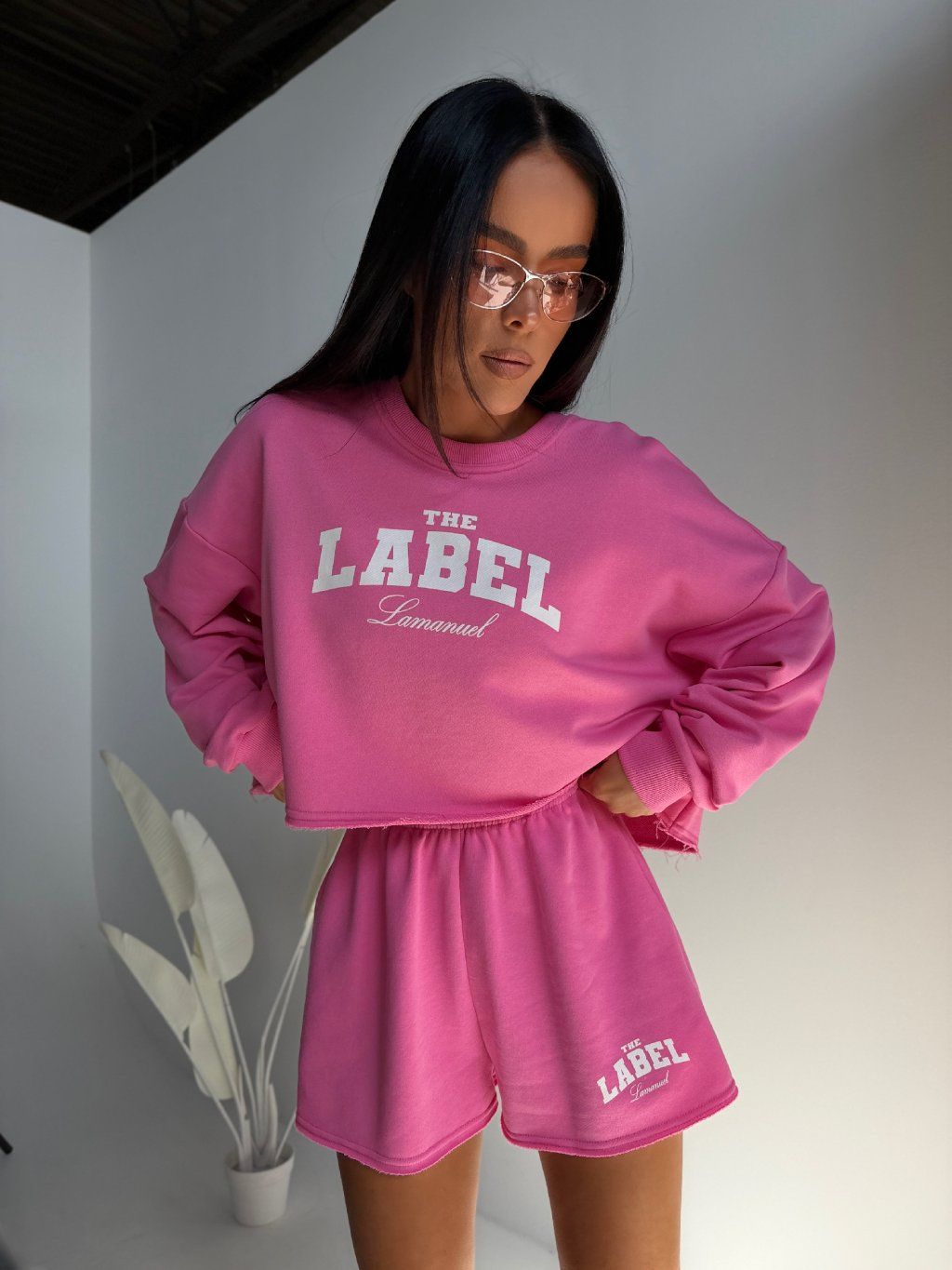 Oversize mikina so zníženou líniou ramien pôsobí uvoľnene a moderne, zatiaľ čo krátke šortky s elastickým pásom krásne sedia na postave a zvýraznia nohy.