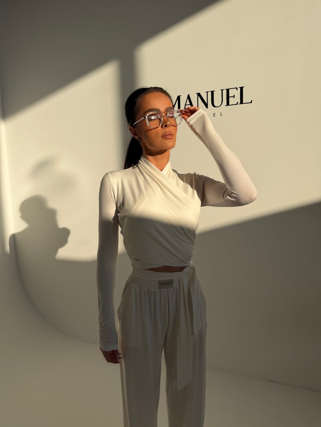 Top z jemnej, elastickej viskózy, ktorý prirodzene kopíruje postavu a pracuje s líniou tela. Krížený výstrih umožňuje nosenie dvoma spôsobmi - bližšie ku krku alebo s otvorenejším V efektom podľa stylingu.