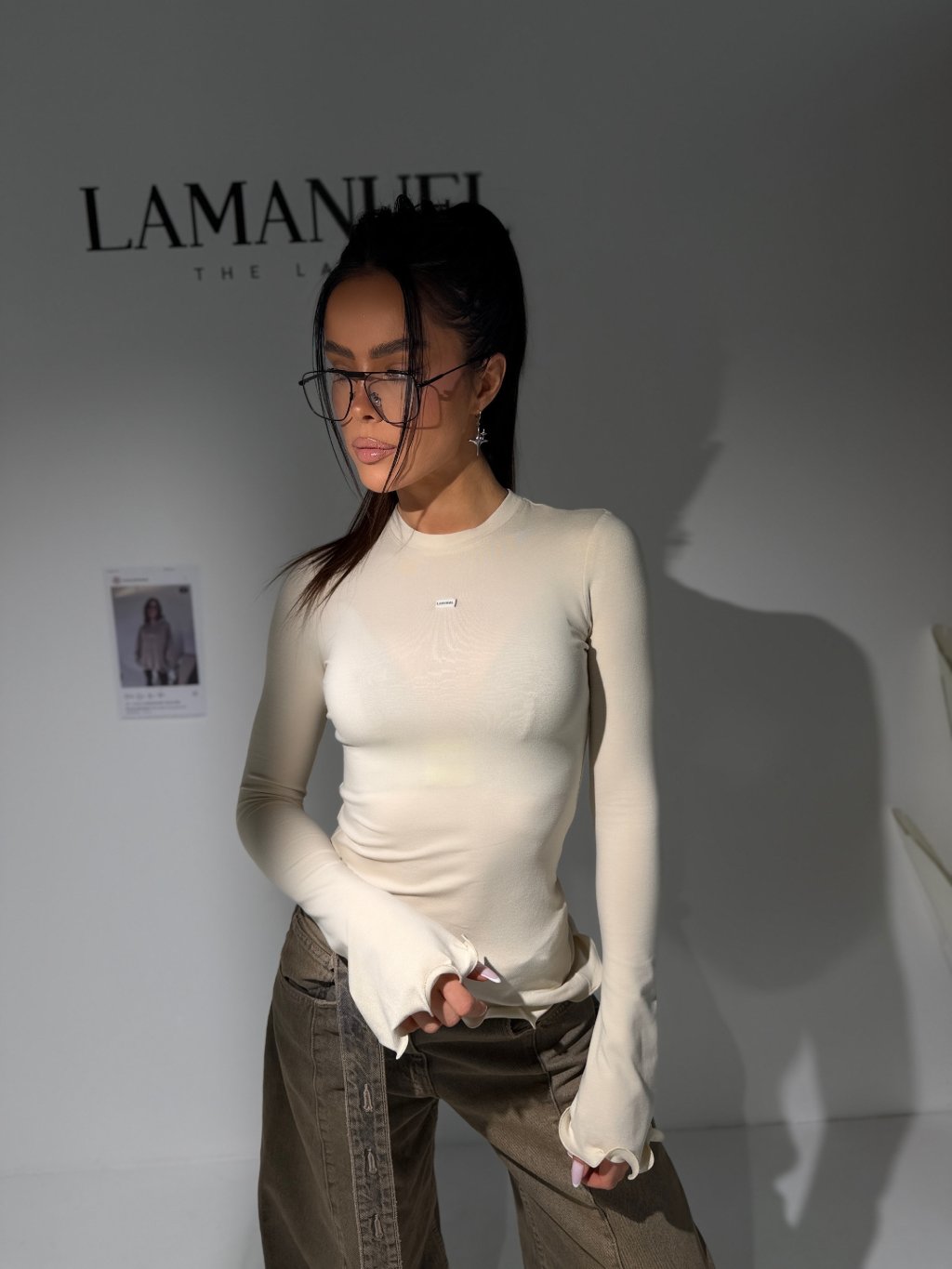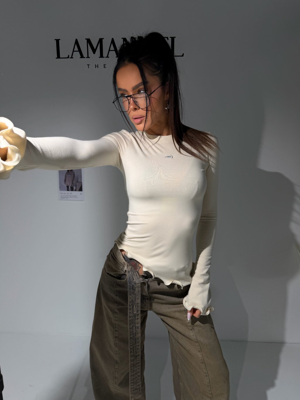 Minimalistický priliehavý top s jemne zvlneným lemom a predĺženými rukávmi.